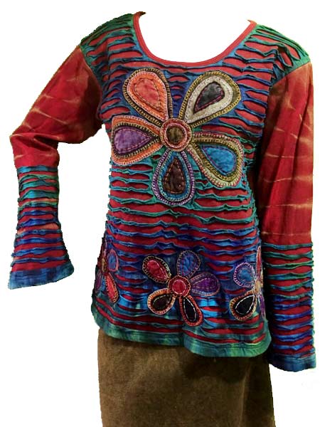 A funky flower top made from patches.